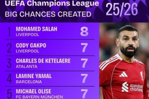 本赛季欧冠创造重大机会榜:萨拉赫领衔红军3将 亚马尔奥利塞在列
